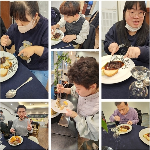자리에 앉자마자 나온 살치살 스테이크를 우와하게 음미한 뒤, 한 쪽에 준비되어 있는 음식들을 먹을 생각에 행복함이 가득한 우리 이용인분들의 모습이 보이시나요?!