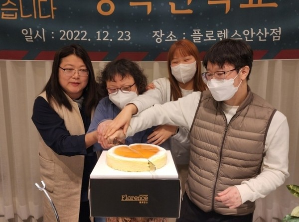 이인숙원장님, 이유주팀장님, 유숙자 이용인대표님과 이민석회장님이 케이크 커팅식으로 한껏 무르익는 종무식이 되었어요. ^_^