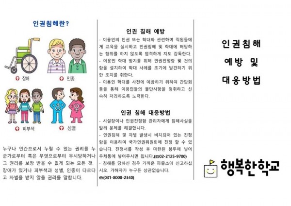행복한학교 인권침해 리플랫 페이지 정보 작성자 행복한학교쪽지보내기 자기소개 아이디로 검색 전체게시물쪽지보내기 자기소개 아이디로 검색 전체게시물 댓글 0건 조회 1,697회 작성일 21-10-22 16:31 본문 오늘은 이용인들에게 인권침해에 대해 설명하고 인권침해를 쉽게 이해할 수 있도록 영상을 통하여 교육을 진행하였습니다.서로의 인권을 침해하지않고 준중하고 인권침해를 예방할 수 있도록 대응방법을 만들어 이용인들에게 전달하였습니다. 서로의 인권을 존중하며 행복한학교에서 즐거운 시간을 보내보아요~! 목록 이전글10월 작업훈련팀 사회적응훈련 21.10.26 다음글추석맞이 특별급식 21.09.30 댓글목록 댓글목록 등록된 댓글이 없습니다.