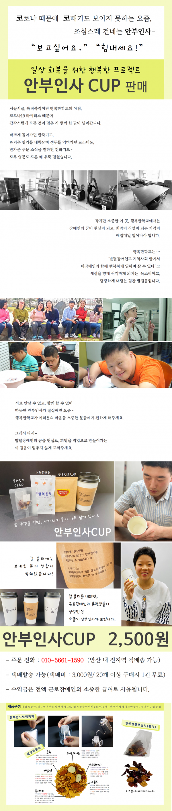 코로나 때문에 코빼기도 보이지 못하는 요즘, 안부인사컵으로 안부를 전하세요! 페이지 정보 작성자 행복한학교쪽지보내기 자기소개 아이디로 검색 전체게시물쪽지보내기 자기소개 아이디로 검색 전체게시물 댓글 0건 조회 2,095회 작성일 20-04-07 13:21 본문 안녕하세요~ 행복지기입니다^^코로나 때문에 어디 쉽게 나가지도, 누굴 쉽게 만나지도 못하는 요즘잘 지내시나요? 시끌시끌 북적이던 행복한학교는,코로나 바이러스 때문에 모든것이 멈추었습니다. 그러던 중 일상 회복을 하고싶은 행복한학교의 마음을 담아행복한 프로젝트, 안부인사 CUP을 준비했습니다!행복한학교 근로장애인들이 직접 안부인사를 쓰고 커피와 차, 견과류까지 만들어 넣은 작지만 알찬 안부인사 컵! 지금 행복한학교에서 판매되고 있으니코로나 때문에 전하기 어려웠던 마음을 전해보세요:) 목록 이전글마음샘정신재활센터 '정신장애인 당사자 평생 Life Partner 성과보고회 및 간담회' 선물셋트 후원 20.05.25 다음글2020년 3월 이용인 자치회의 및 생일파티 20.03.18 댓글목록 댓글목록 등록된 댓글이 없습니다.