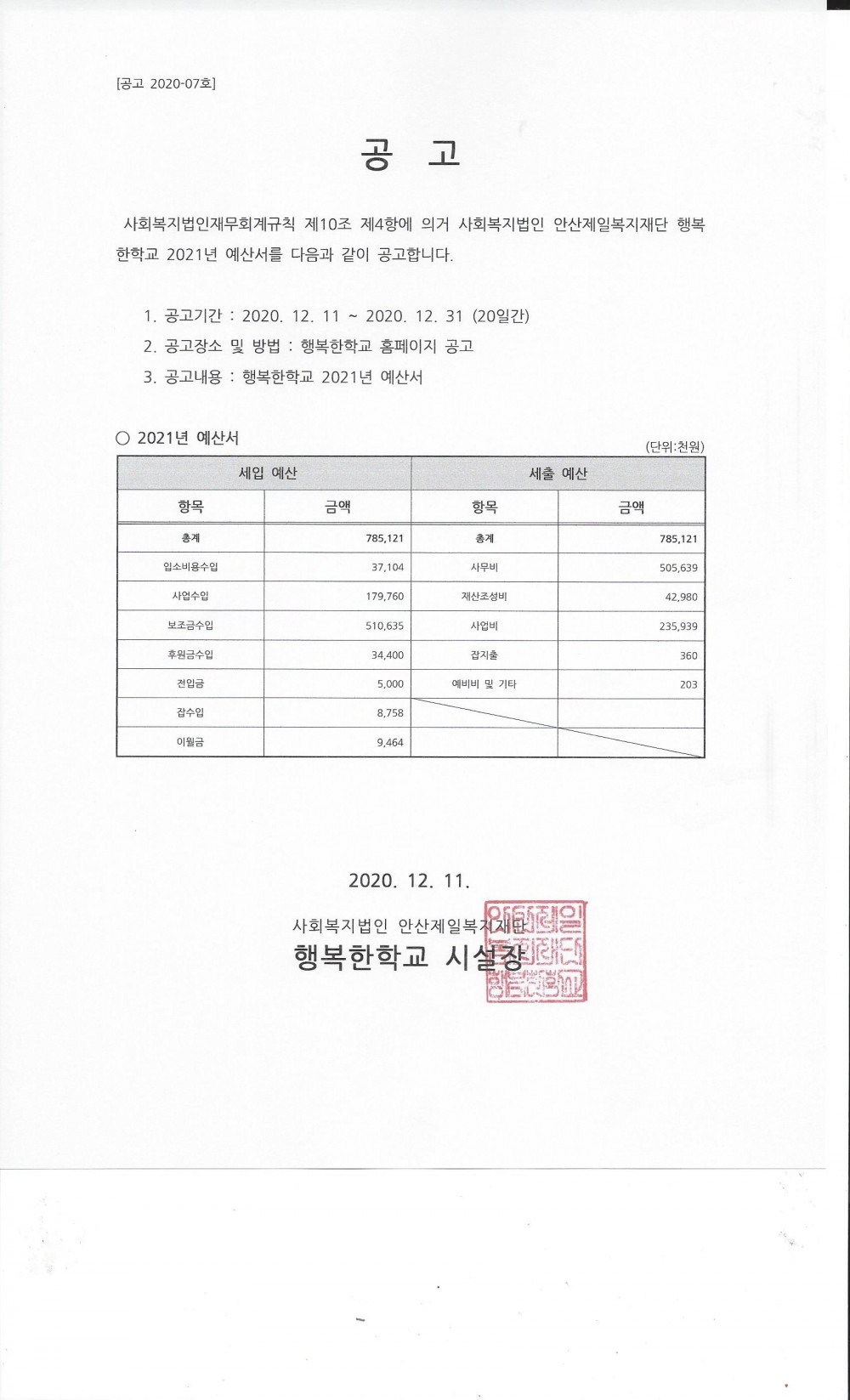 행복한학교 2021년도 운영예산서 공고 페이지 정보 작성자 행복한학교 작성일20-12-11 17:39 조회3,906회 관련링크 본문 "사회복지법인 안산제일복지재단 행복한학교는 사회복지법인 및 사회복지시설 재무회계규칙 제10조 제4항에 의거하여 「2021년도 운영예산서」 를 공고합니다. 첨부파일을 다운로드하시면 열람하실 수 있습니다." 목록 이전글사회적거리두기 2단계에 따른 대응 조치 시행 21.03.02 다음글행복한학교 2020년 2차 추가경정예산 공고 20.12.11