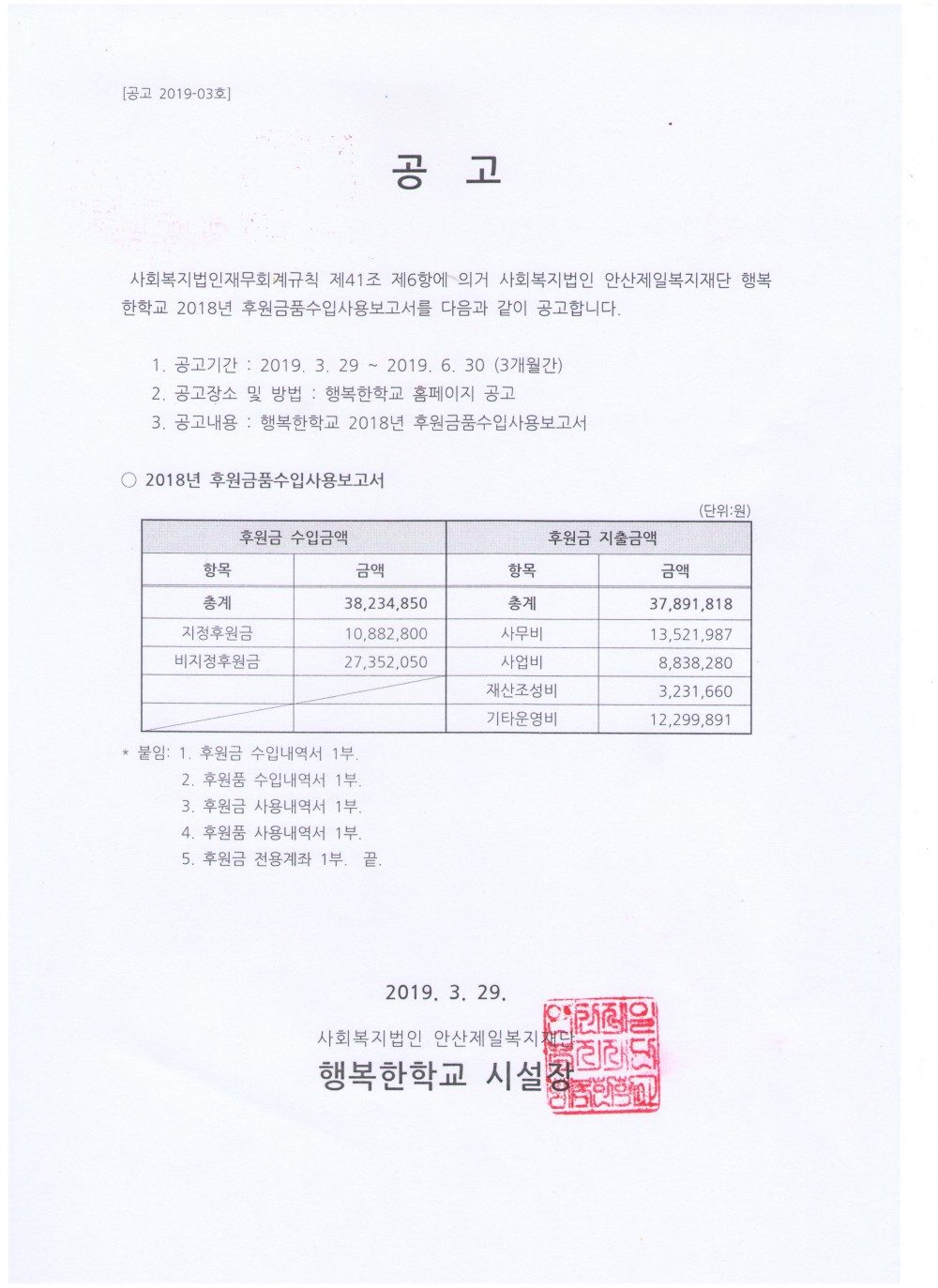 사회복지법인 안산제일복지재단 행복한학교는 사회복지법인 및 사회복지시설 재무회계규칙 제41조 제6항에 의거하여 「2018년도 후원금품 수입 및 사용내역」 을 공고합니다. 첨부파일을 다운로드하시면 열람하실 수 있습니다.