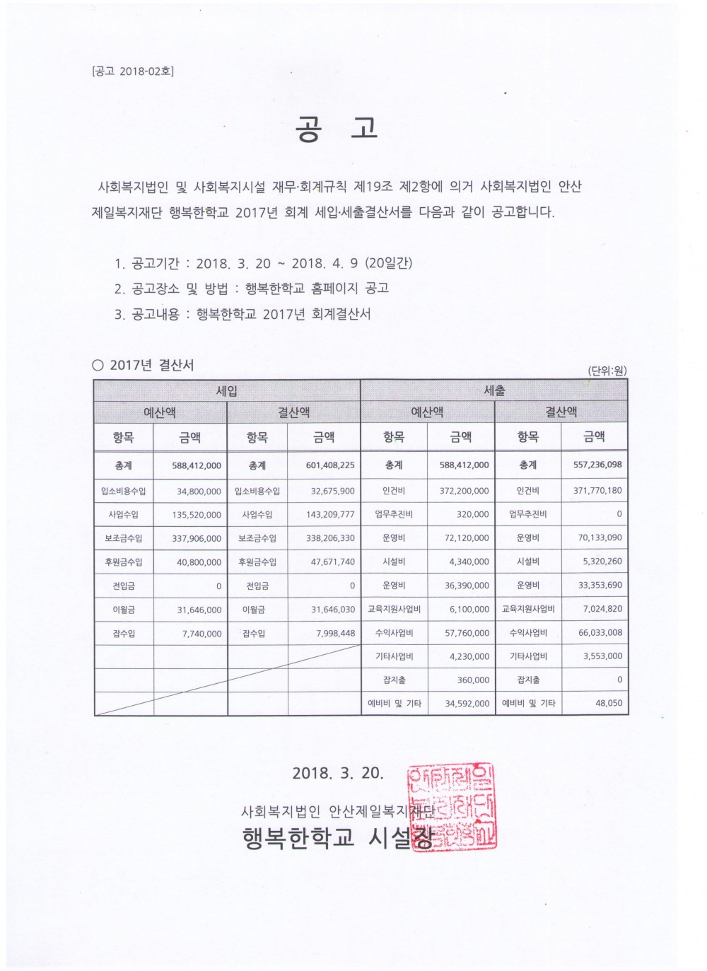 행복한학교 2017년도 회계결산서 공고