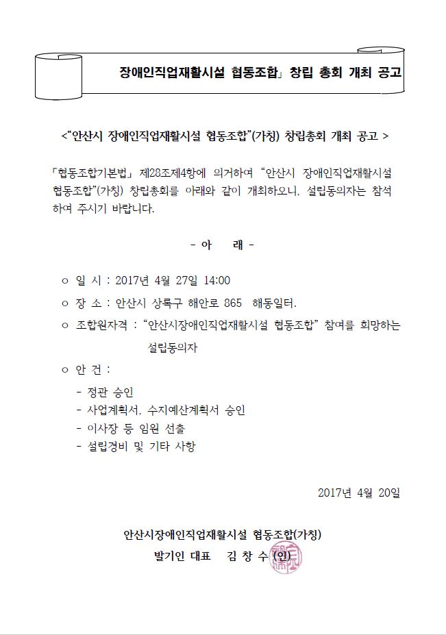 안산시 직업재활시설 협동조합 창립총회 공고 페이지 정보 작성자 행복지기 작성일17-04-26 00:00 조회2,697회 관련링크 본문 "" 목록 이전글2017년 2차 추경 예산(안) 공지 17.12.08 다음글2016년도 후원금품 수입 및 사용내역 공고 17.04.05