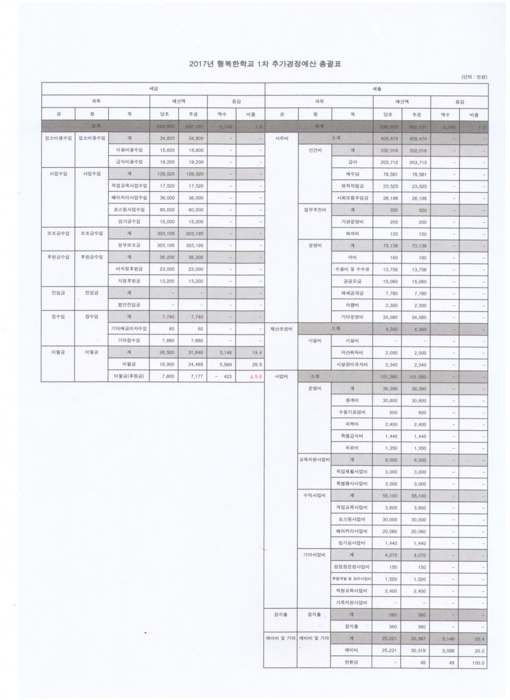 2017년 1차 추경 예산(안) 공지 페이지 정보 작성자 행복한학교 작성일17-03-10 00:00 조회2,772회 관련링크 본문 2017년 1차 추경 예산(안)을 공지합니다. 목록 이전글2016년 회계결산서 공고 17.03.20 다음글(채용공고)행복한학교 보호작업장 직업훈련교사 채용공고 17.03.09